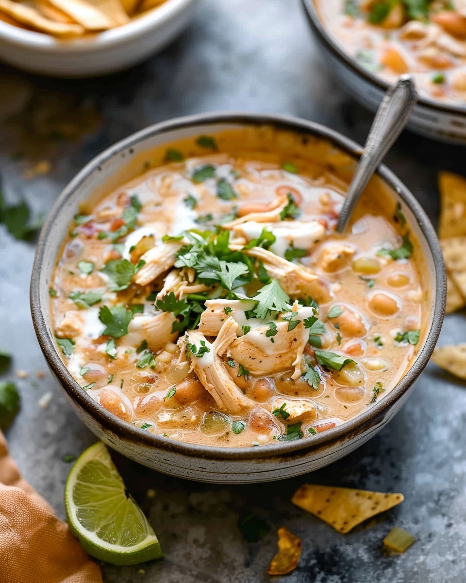 This Creamy White Chicken Chili is a hearty, comforting dish featuring shredded chicken, white beans, green chilies, corn, and warming spices in a creamy broth. It's perfect for cozy nights and comes together in just 45 minutes.