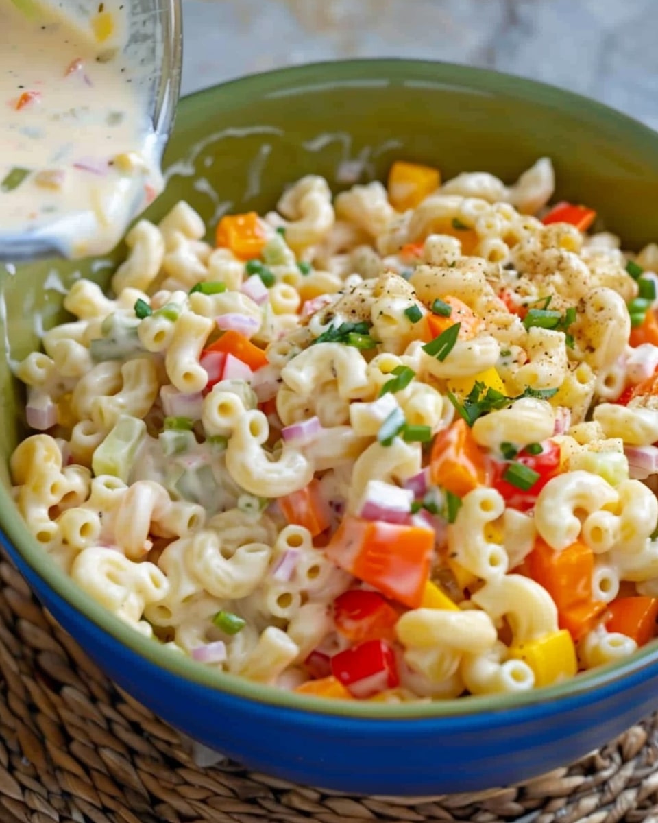 Pour the dressing over the macaroni mixture and stir until everything is evenly coated.