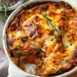 A hearty vegetarian moussaka-style casserole made with roasted eggplant, potatoes, lentils, and tomatoes, finished with a creamy béchamel topping baked until golden. This comforting dish delivers rich Mediterranean flavor in a satisfying meatless meal.