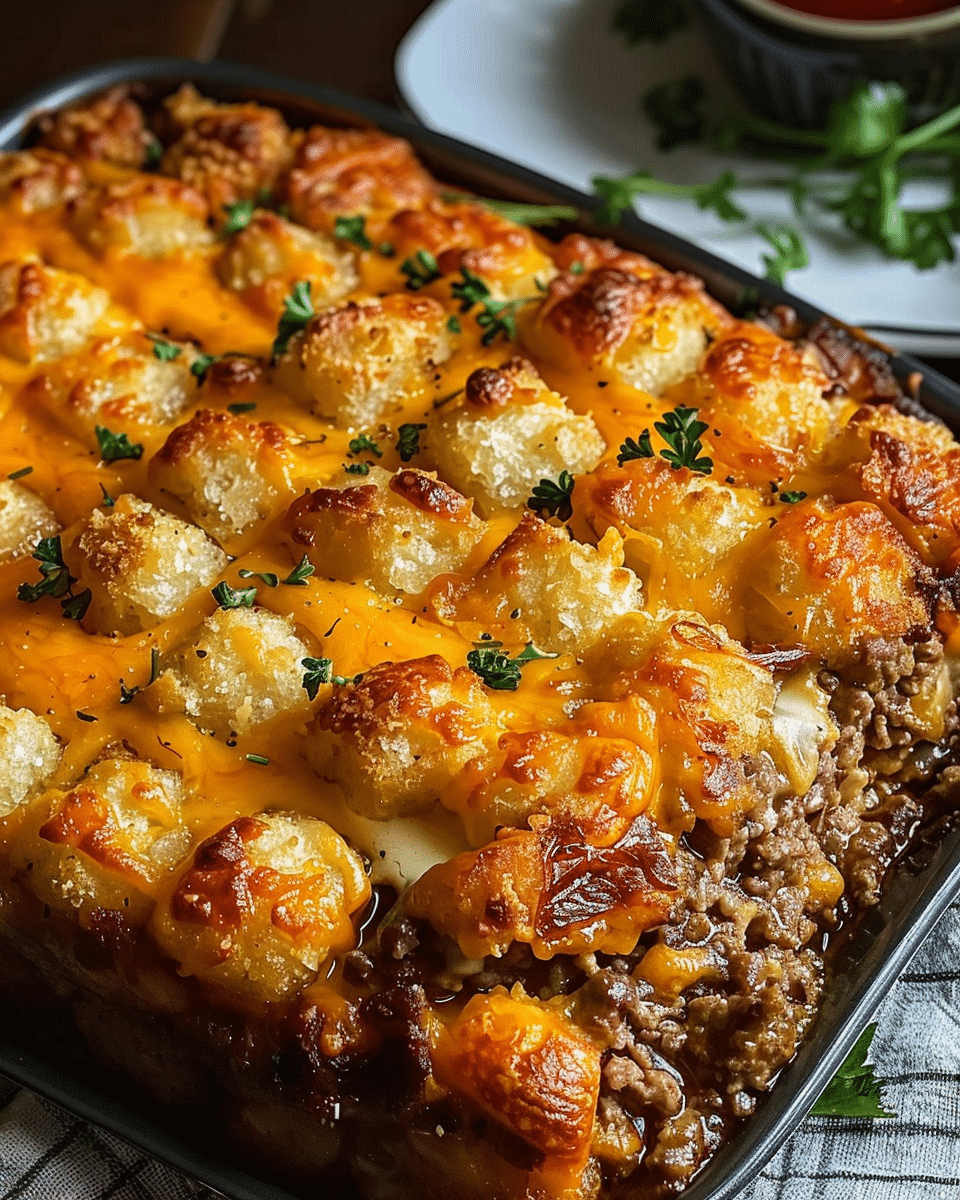Bake uncovered for 35–40 minutes, or until the meat is fully cooked and the tater tots are golden brown.