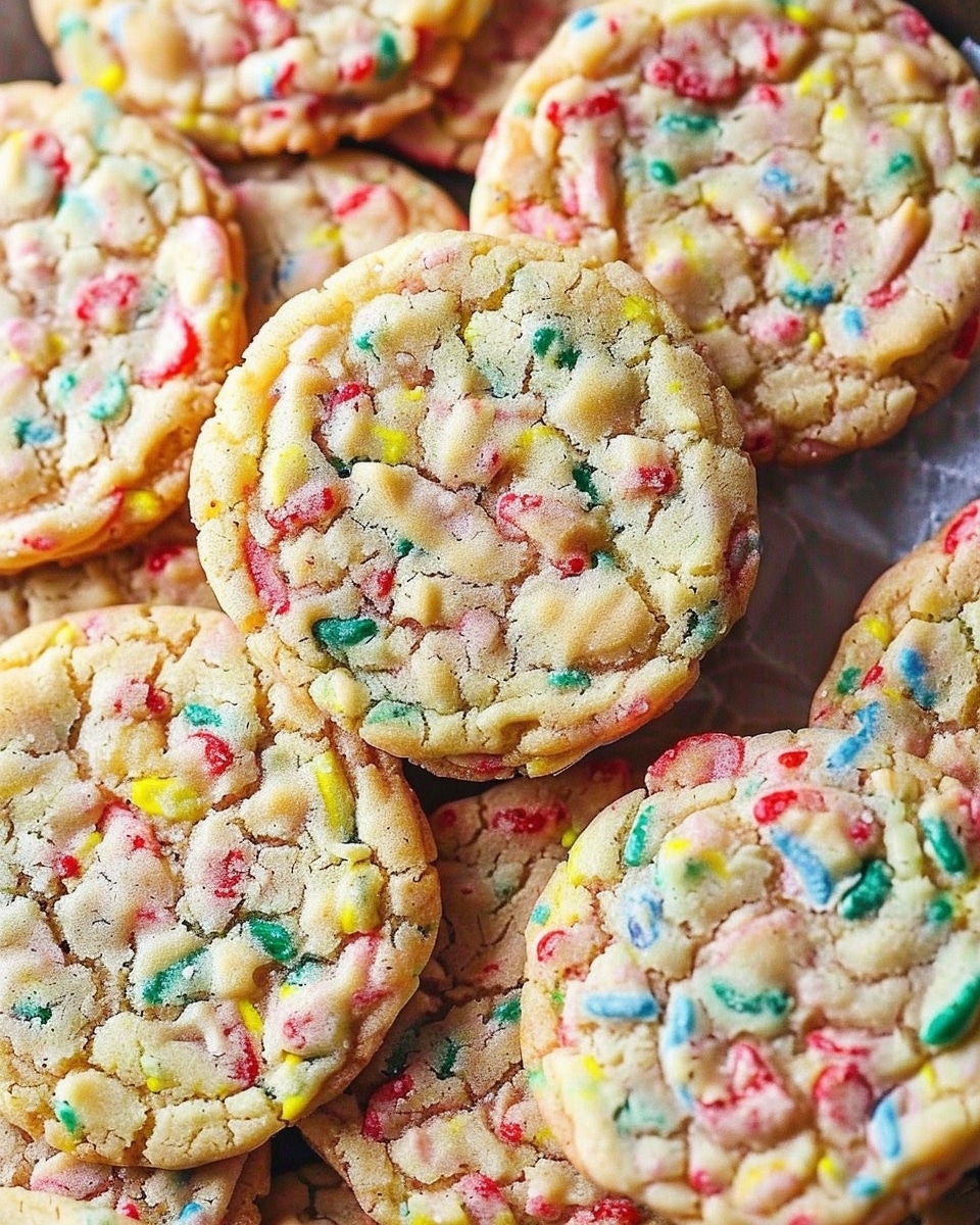 Soft and chewy sugar cookies loaded with colorful Fruity Pebbles cereal for a fun, fruity crunch in every bite. Perfect for parties, bake sales, or brightening up any dessert table.
