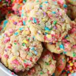 Soft and chewy sugar cookies loaded with colorful Fruity Pebbles cereal for a fun, fruity crunch in every bite. Perfect for parties, bake sales, or brightening up any dessert table.