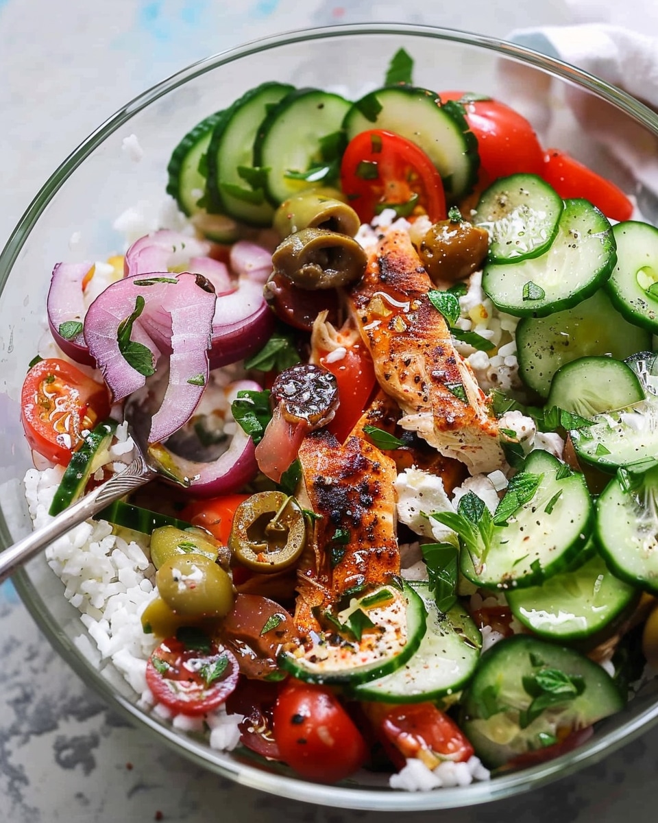 This Mediterranean Chicken Bowl features tender marinated chicken served over fluffy rice with a fresh cucumber tomato salad and creamy homemade tzatziki sauce. Bright lemon, warm spices, and fresh herbs create a vibrant and satisfying meal.