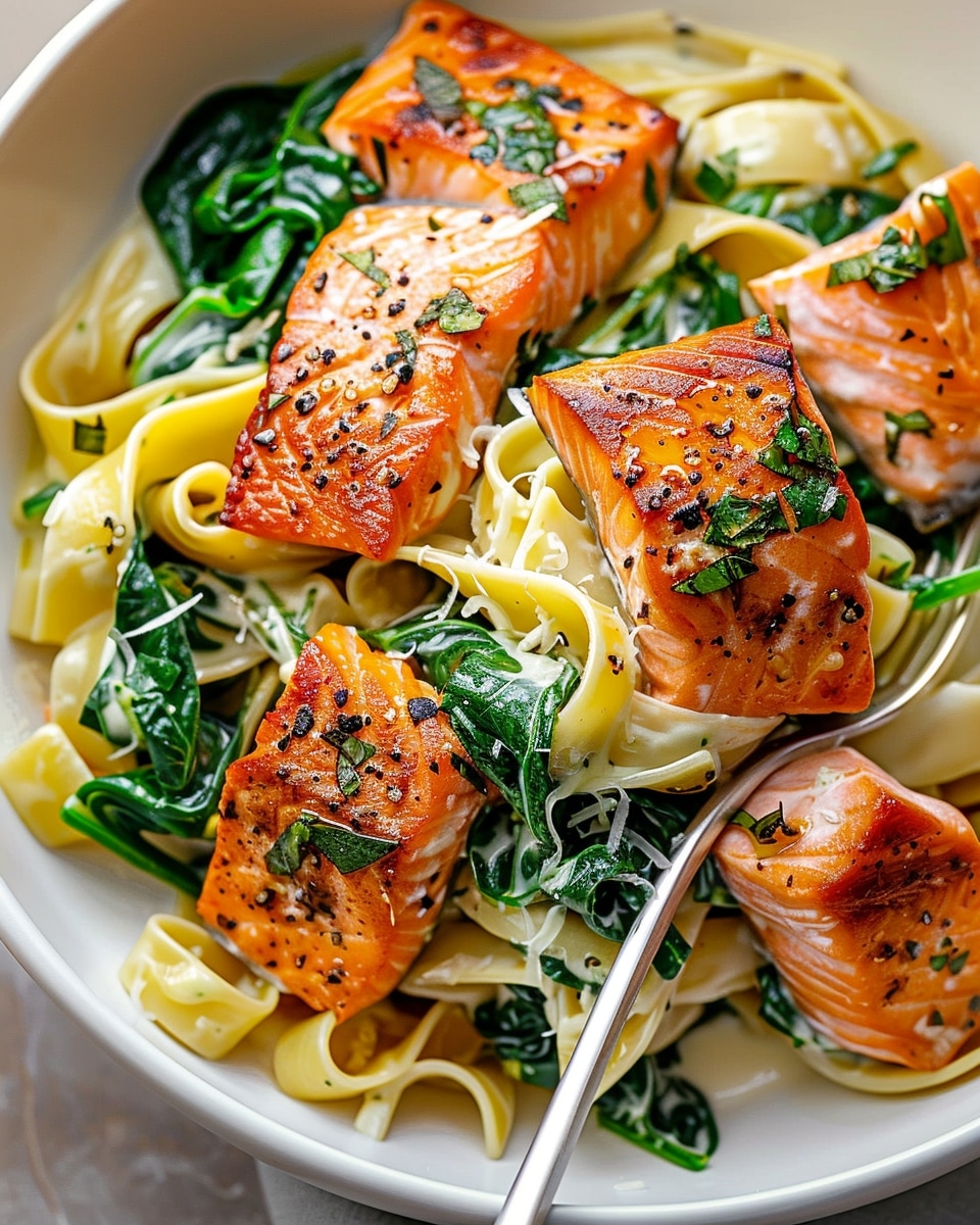A creamy salmon spinach pasta made with tender flakes of salmon, fresh spinach, and pasta tossed in a rich Parmesan cream sauce with bright lemon flavor. This quick and satisfying dish is perfect for weeknight dinners or special occasions.